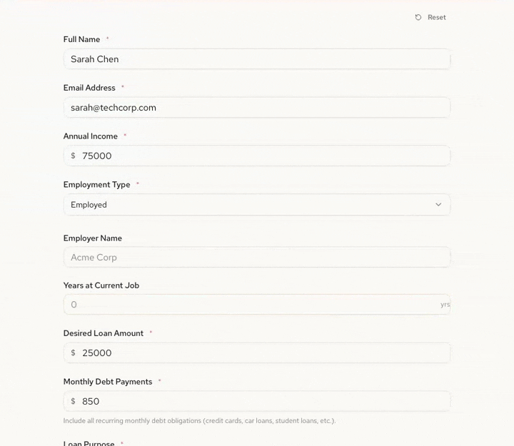 We asked Formidable to build a simple loan application. Five fields: name, email, income, loan amount, purpose. What came back was a form we wouldn't have designed ourselves—and a lesson in what happens when AI actually understands form design. Two messages. Under three minutes.