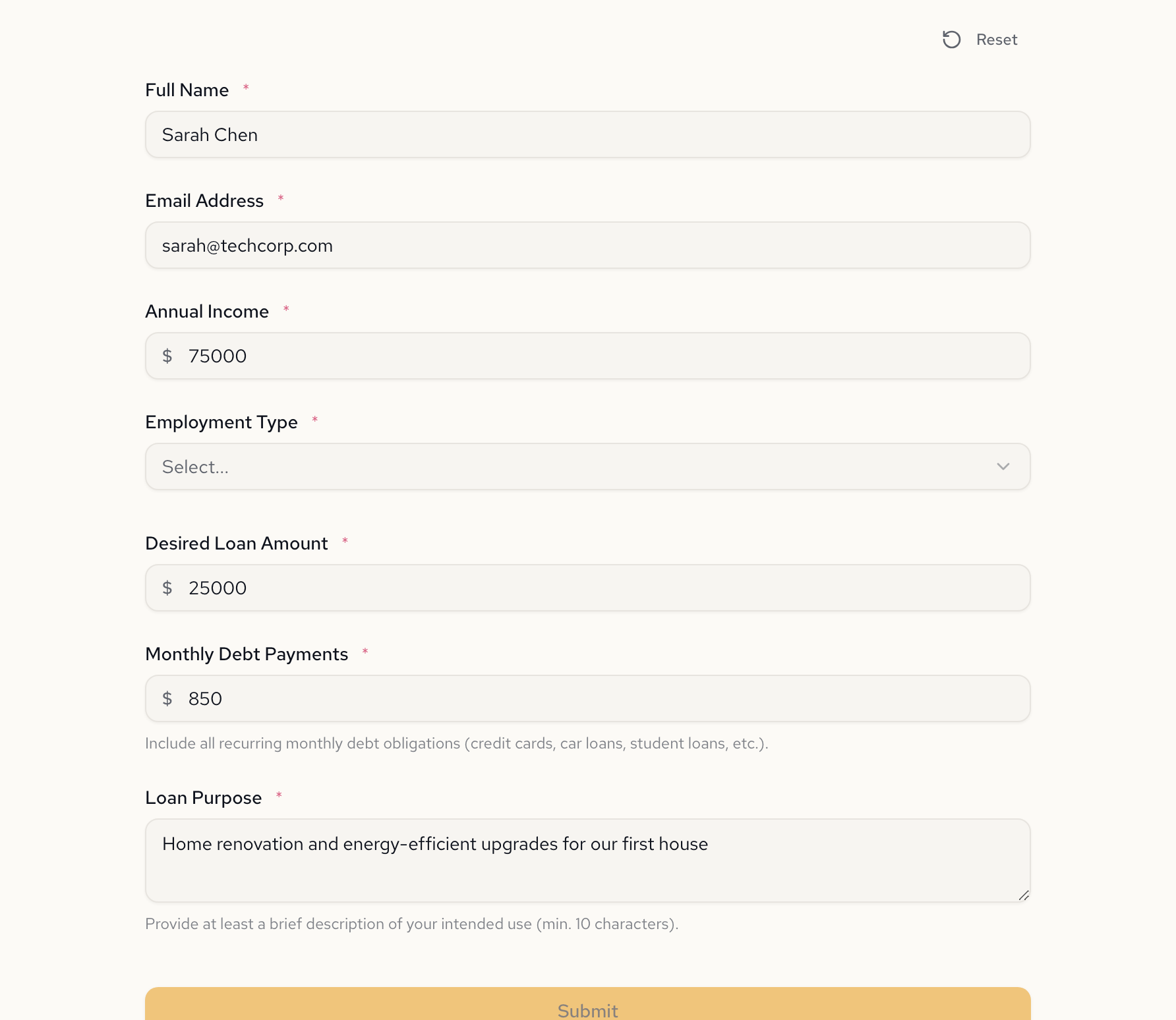 Create a simple loan application form. Collect the applicant's full name, email, annual income, desired loan amount, and loan purpose.