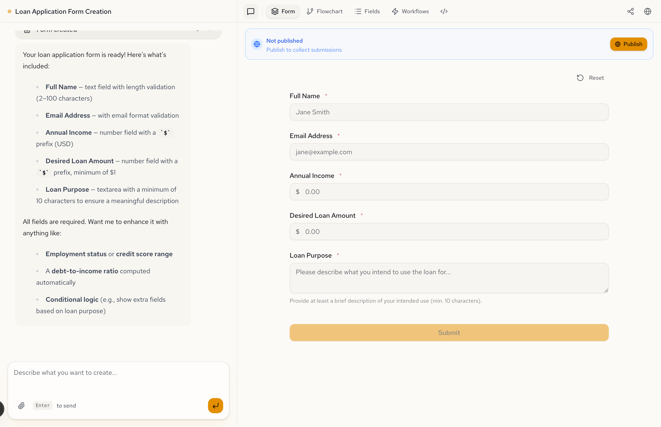 But here's the thing the AI pointed out unprompted: all fields are required, and it suggested three ways to make the form smarter. Employment status. A debt-to-income ratio computed automatically. Conditional logic based on loan purpose.